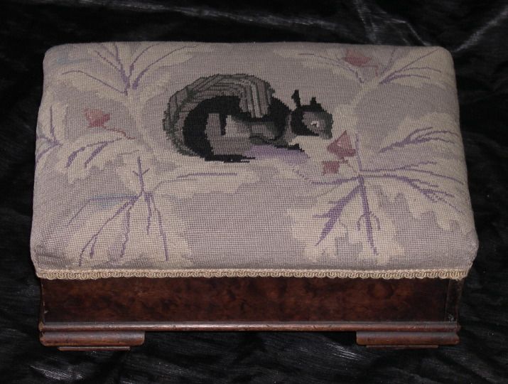 Diminutive American Classical Mahogany Footstool, second quarter 19th century, upholstered in a later gray, ivory and lavender petit-point panel featuring a gray and black squirrel, h. 7", w. 9-1/2", L. 14-1/4". Diminutive American Classical Mahogany Footstool, second quarter 19th century, upholstered in a later gray, ivory and lavender petit-point panel featuring a gray and black squirrel, h. 7", w. 9-1/2", L. 14-1/4".