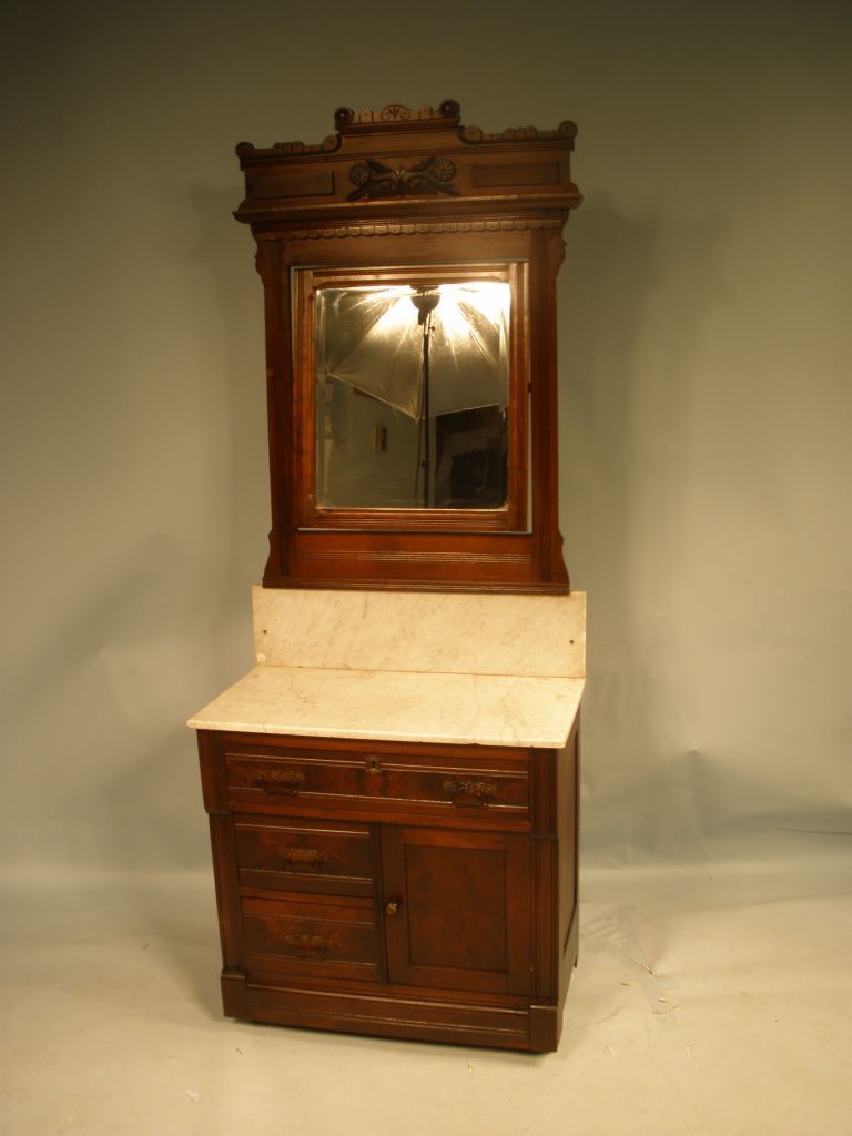 Walnut Eastlake Washstand, white marble top with mirror, h. 80", w. 30". Walnut Eastlake Washstand, white marble top with mirror, h. 80", w. 30".