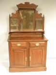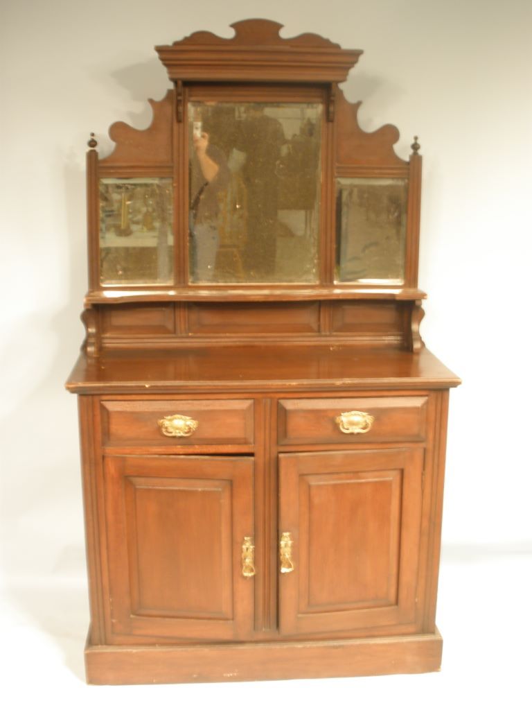 Nice Mahogany Sideboard with Beveled Mirror. One large center mirror with 2 smaller mirrors mounted on each side. -h. 75" x w. 42" d. 18" Nice Mahogany Sideboard with Beveled Mirror. One large center mirror with 2 smaller mirrors mounted on each side. -h. 75" x w. 42" d. 18"