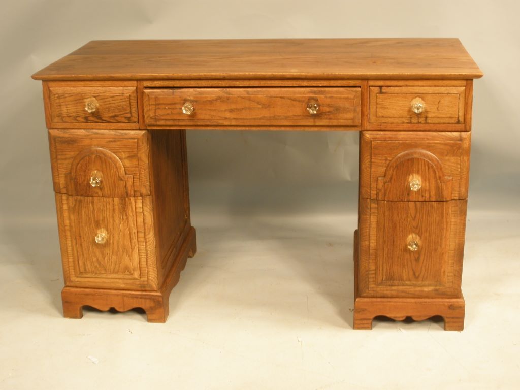 Small Oak desk with 7 drawers. Drawers have glass pull knobs.-h. 30" x w. 48" d. 22" Small Oak desk with 7 drawers. Drawers have glass pull knobs.-h. 30" x w. 48" d. 22"