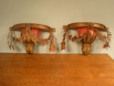 Pair of Ornate Wall Sconces and decorative metal wall sconces, Urn shape with brown and red paint. h. 14" x w. 245 1/2" Pair of Ornate Wall Sconces and decorative metal wall sconces, Urn shape with brown and red paint. h. 14" x w. 245 1/2"