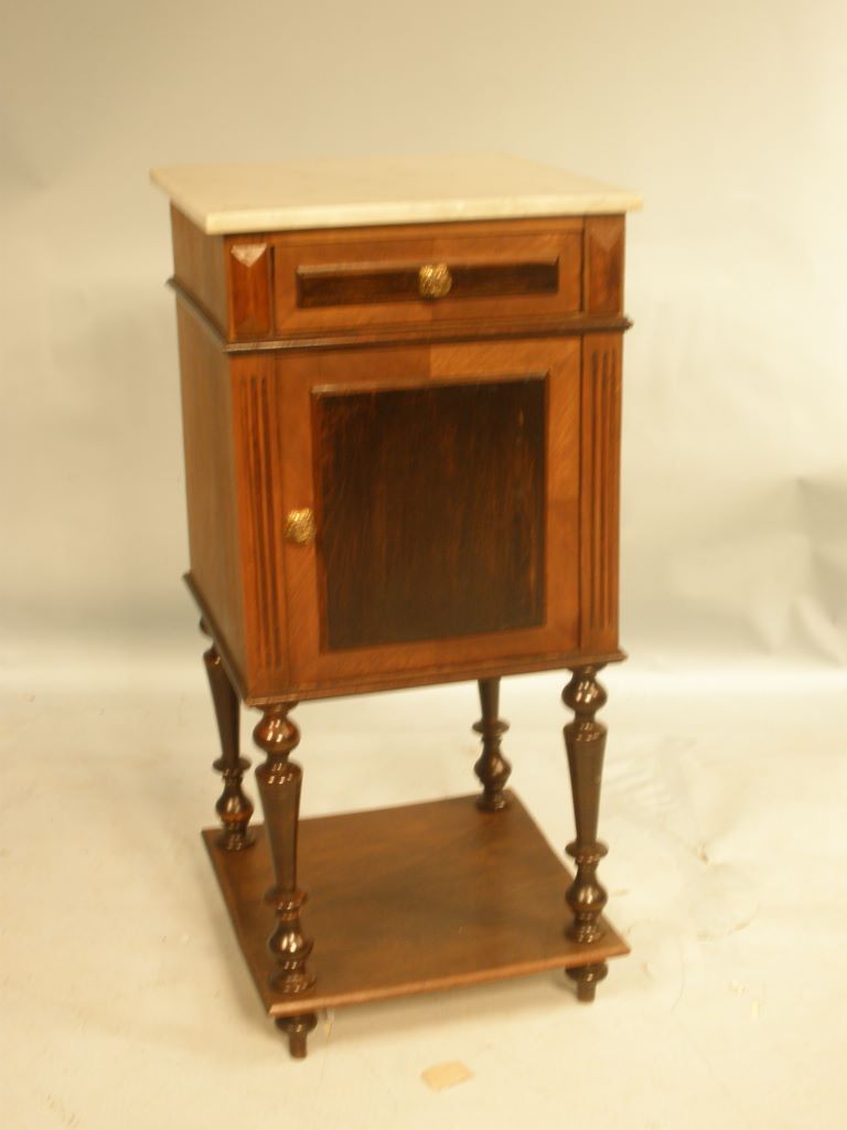 Nice walnut Marble Top Night Stand, white marble with one drawer, turned legs, one shelf on bottom, one drawer and single door storage, h. 34 1/2" x w. 16" d. 16". Nice walnut Marble Top Night Stand, white marble with one drawer, turned legs, one shelf on bottom, one drawer and single door storage, h. 34 1/2" x w. 16" d. 16".