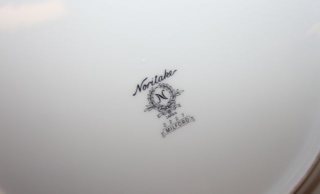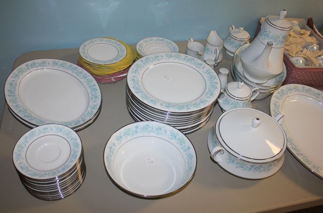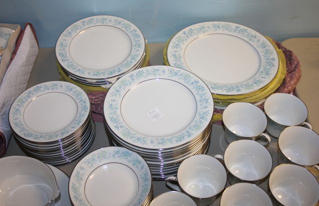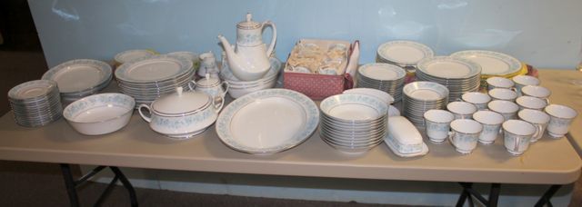 Large Set of Noritake China "Milford" Pattern, blue and white floral design; eighteen dinner plates, twenty-two salad plates, twenty-one bread plates, ten soup bowls, twelve dessert bowls, twenty-two cups, twenty saucers, fourteen serving pieces (two cups with chips) Large Set of Noritake China "Milford" Pattern, blue and white floral design; eighteen dinner plates, twenty-two salad plates, twenty-one bread plates, ten soup bowls, twelve dessert bowls, twenty-two cups, twenty saucers, fourteen serving pieces (two cups with chips)