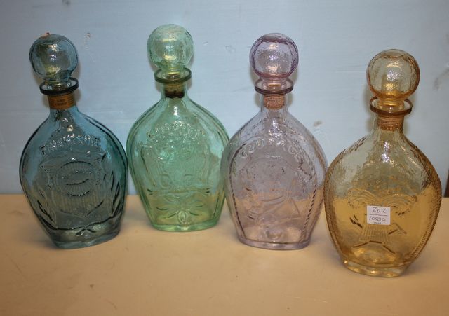 Group of Four Vintage Lord Calvert Canadian Whiskey Decanters, with stoppers, 1960's; green, amber, amethyst and blue Group of Four Vintage Lord Calvert Canadian Whiskey Decanters, with stoppers, 1960's; green, amber, amethyst and blue