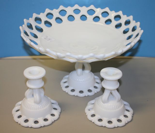 Vintage Milk Glass Reticulated Compote and Pair of Milk Glass Candlestick Holders, believed to be Westmoreland but not marked; compote 6 1/2" h., 11" w., candlestick holders 4 1/2" h. Vintage Milk Glass Reticulated Compote and Pair of Milk Glass Candlestick Holders, believed to be Westmoreland but not marked; compote 6 1/2" h., 11" w., candlestick holders 4 1/2" h.