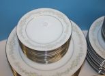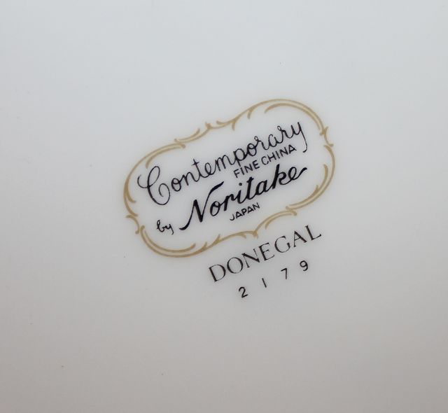 Set of Contemporary Fine China by Noritake "Donegal" Pattern, includes; eleven dinner plates, twelve salad plates, twelve cups with saucers, twelve bread plates, twelve soup bowls, twelve berry bowls, cream and sugar, salt and pepper, platter and gravy boat Set of Contemporary Fine China by Noritake "Donegal" Pattern, includes; eleven dinner plates, twelve salad plates, twelve cups with saucers, twelve bread plates, twelve soup bowls, twelve berry bowls, cream and sugar, salt and pepper, platter and gravy boat