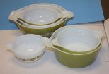 Set of Four Vintage "Crazy Daisy" Pyrex Cinderella nesting Mixing Bowls and Two Pyrex Green Nesting Bowls, all in excellent condition Set of Four Vintage "Crazy Daisy" Pyrex Cinderella nesting Mixing Bowls and Two Pyrex Green Nesting Bowls, all in excellent condition