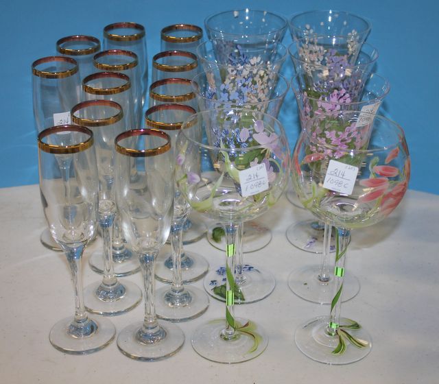 Set of Twelve Gold Rim Champagne Flutes and Eight Hand Painted Wine Glasses with floral design Set of Twelve Gold Rim Champagne Flutes and Eight Hand Painted Wine Glasses with floral design