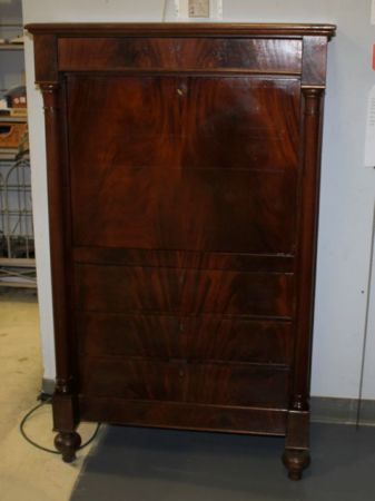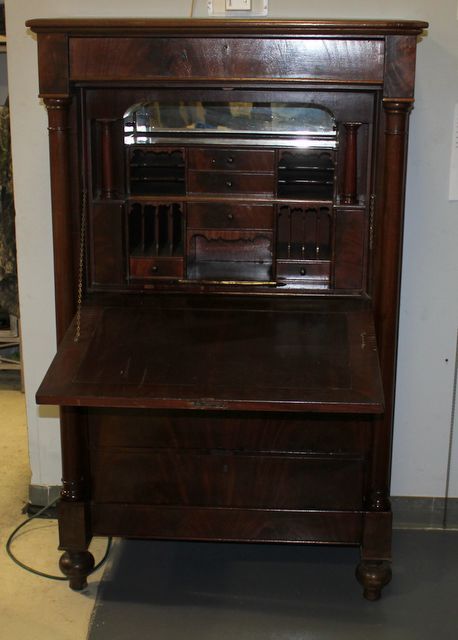Early Flame Mahogany Drop Front Secretary Desk with columns, 58"h., 35"w., 18"d. Early Flame Mahogany Drop Front Secretary Desk with columns, 58"h., 35"w., 18"d.
