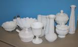 14 pieces Vintage Milk Glass includes 7" covered jar, vases, bowls, salt and pepper. 14 pieces Vintage Milk Glass includes 7" covered jar, vases, bowls, salt and pepper.