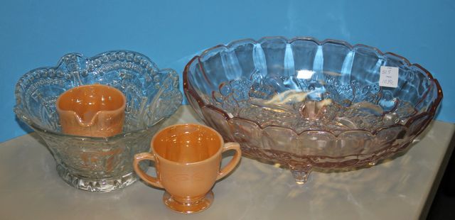 Pink Glass Fruit Bowl, Lusterware Creamer & Sugar, Press Glass Bowl Pink Glass Fruit Bowl, Lusterware Creamer & Sugar, Press Glass Bowl