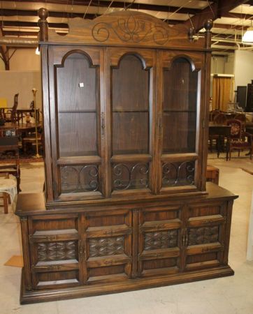 1970s Mediterrian 2 pc. Breakfront, 83"h., 69"w., 19"d. 1970s Mediterrian 2 pc. Breakfront, 83"h., 69"w., 19"d.
