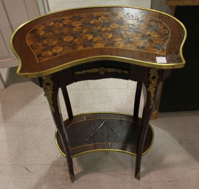 French Inlaid Small Bronze Armolued Table with one drawer, 29"h., 21"L., 14"d. French Inlaid Small Bronze Armolued Table with one drawer, 29"h., 21"L., 14"d.