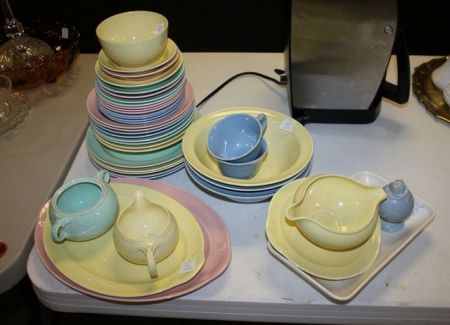417 Lu Ray Pastels Including 5 Plates, 8 cereal bowls, 12 saucers, 2 berry bowls, bowl, salt, 2 cups, 3 vegetable bowls, platters, creamer and sugar, gravy.