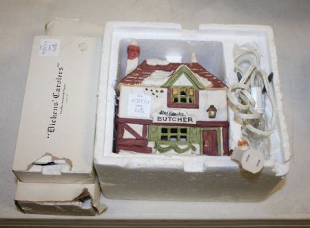 Hand Painted Porcelain Figure "Dickens Carolers", Village Train, and Bucher Shop. Hand Painted Porcelain Figure "Dickens Carolers", Village Train, and Bucher Shop.