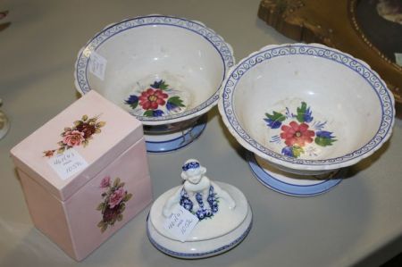 Pink Porcelain box, Covered Jar with gill on top 4"w, and two made in china Compotes 6"dia. Pink Porcelain box, Covered Jar with gill on top 4"w, and two made in china Compotes 6"dia.