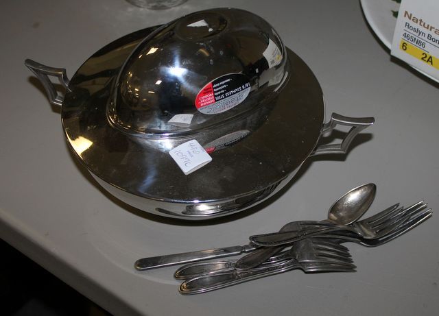 490 Stainless Steel Oral Bowl, Silverplate Flatware, and Royal Rogester Covered Tureen