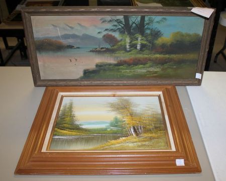 Two Vintage Landscape Paintings Vintage landscape painting 30"w., 14"h., and Landscape painting signed lower right, 23"w., 19"h. Two Vintage Landscape Paintings Vintage landscape painting 30"w., 14"h., and Landscape painting signed lower right, 23"w., 19"h.