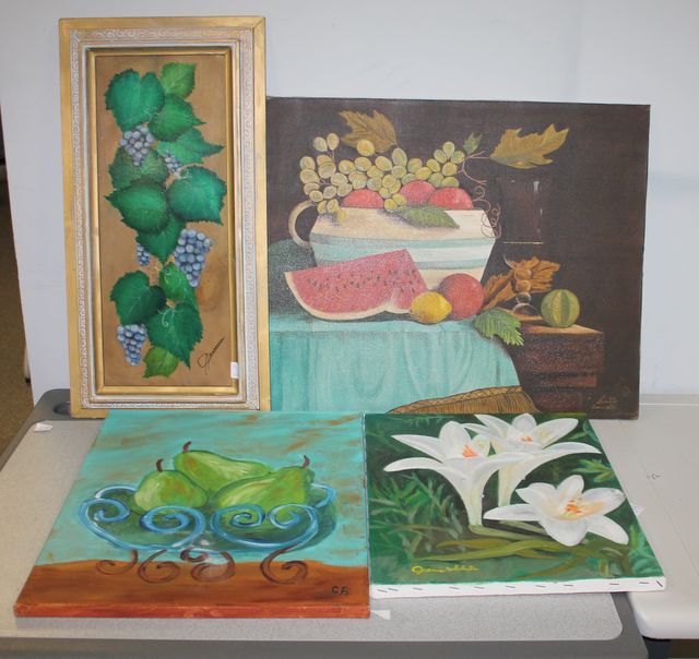 Painting of Grapes on Board 12"w., 24"h., Painting of Lilies signed, and Painting of Fruit on Table signed Lucille Lucanelli, 23"w., 19"h. Painting of Grapes on Board 12"w., 24"h., Painting of Lilies signed, and Painting of Fruit on Table signed Lucille Lucanelli, 23"w., 19"h.