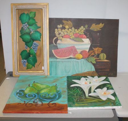 572 Painting of Grapes on Board, Painting of Lilies signed, and Painting of Fruit on Table