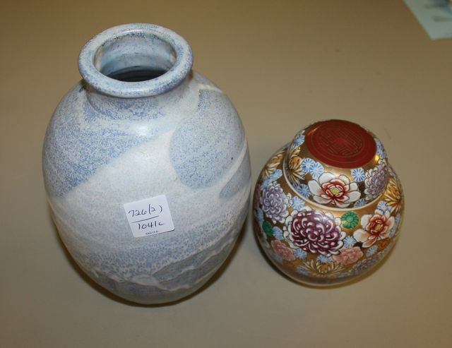 726 Blue and White Pottery Vase Signed Moni Signed on bottom 8"h., Oriental small ginger jar.