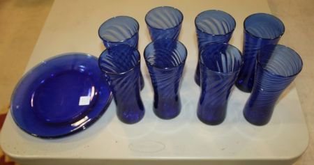 256 Two Cobalt Glass Plates and Eight Glasses Plates 10 1/2" dia., glasses 7" h.