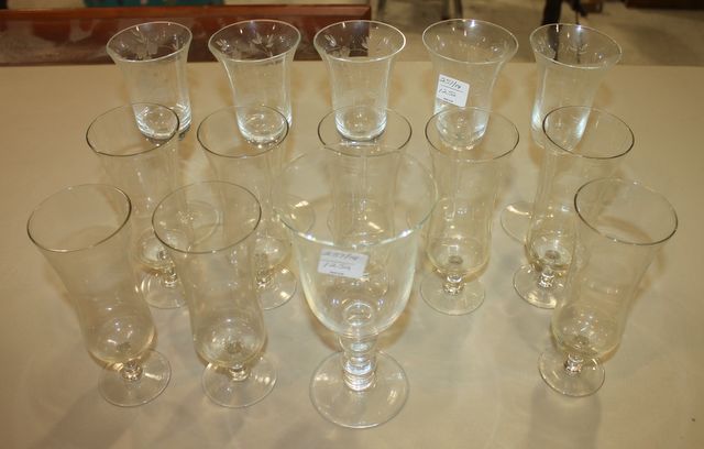 Fourteen Clear Glasses Five etched; 7 1/2" h. Fourteen Clear Glasses Five etched; 7 1/2" h.