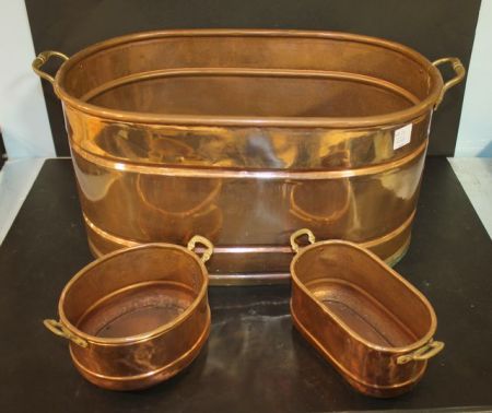 Copper Boiler, Small Oval Copper Pot, and Round Copper Pot Boiler 18 1/2" w., oval pot 7" w., round pot 6 1/2" dia. Copper Boiler, Small Oval Copper Pot, and Round Copper Pot Boiler 18 1/2" w., oval pot 7" w., round pot 6 1/2" dia.