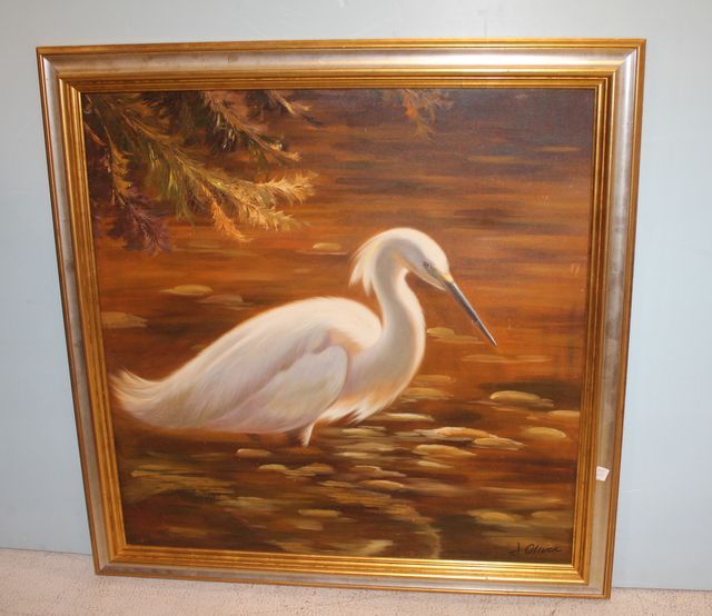 323 Large Oil Painting of Egret Signed J. Oliver; 41 1/2" w., 42" h.