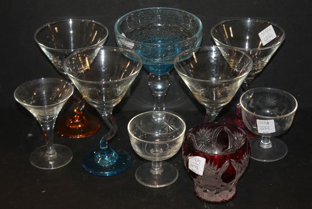 359 Four Color Base Champagne Glasses, Four Assorted Glasses, Cut Bohemian Ruby Red Candle Jar Jar is 4" h.