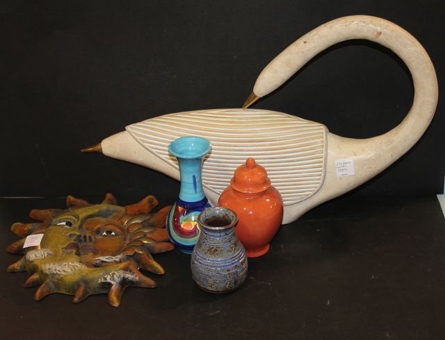 371 Chipped Gail Pittman Vase, Ginger Jar, Pottery Vase, Sun / Moon Plaque, Handmade in the Philippines Swan Ginger jar 4" h., pottery vase 4" h., plaque 10" dia.