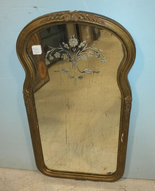Deco Etched Mirror in Gold Frame 14" w., 26" h. Deco Etched Mirror in Gold Frame 14" w., 26" h.