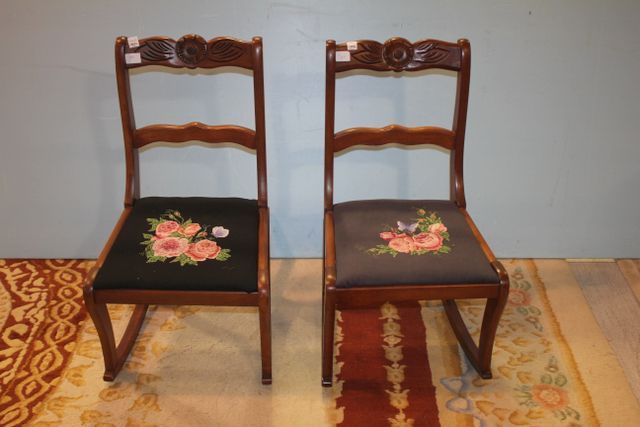 Two Rose Carved Lady's Rockers with Needlepoint Two Rose Carved Lady's Rockers with Needlepoint