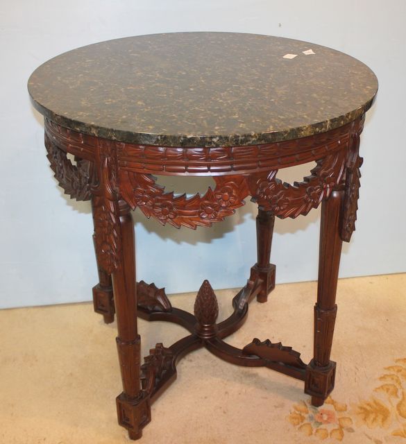 Heavily Carved Marble Top Center Table 30" d., 31" h. Heavily Carved Marble Top Center Table 30" d., 31" h.