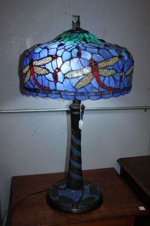 567 Dragonfly Tiffany Style Blue Leaded Glass Lamp Base has mosaic dragonflies; shade 20" dia., base 35" h.