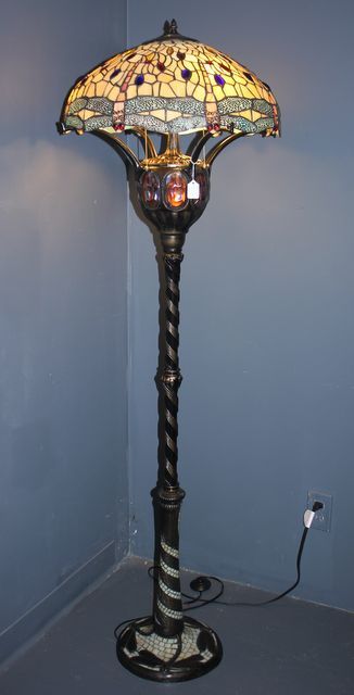 568 Dragonfly Tiffany Style Leaded Glass Floor Lamp Base has mosaic dragonflies and center lights up; shade 22" dia., base 72" h.