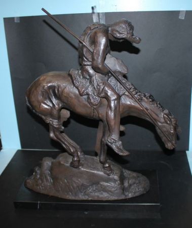 588 Cast Iron End of the Trail Sculpture on Marble Base Signed and dated; 25" h., 17" w.