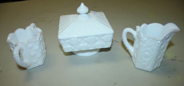 Three Pieces of Milk Glass Covered square dish, creamer, sugar Three Pieces of Milk Glass Covered square dish, creamer, sugar