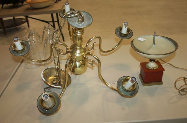 Five Light Brass Chandelier with Hurricane Shades and Small Lamp Chandelier 21" dia., lamp 15" h. Five Light Brass Chandelier with Hurricane Shades and Small Lamp Chandelier 21" dia., lamp 15" h.