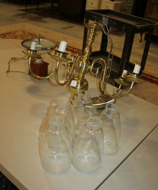 692 Five Light Brass Chandelier with Hurricane Shades and Small Lamp Chandelier 21" dia., lamp 15" h.