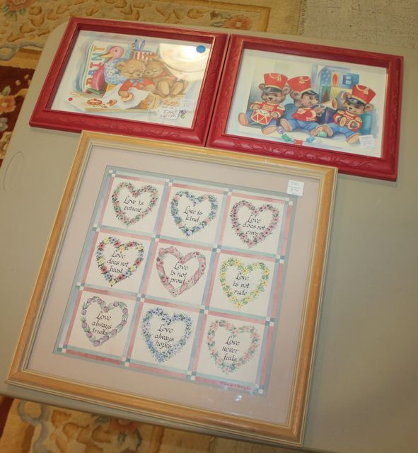718 Two Teddy Bear Prints and Love Is Bear prints 13" w., 10" h.; Love Is 17" sq.