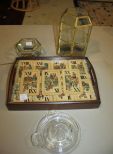 744 Wooden Tray with Early Playing Cards, Glass Juicer, Brass and Beveled Glass Jewelry Box, Brass and Glass Display