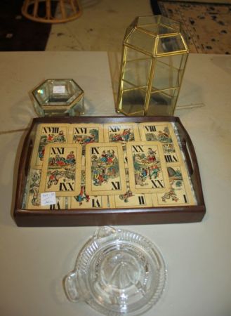 Wooden Tray with Early Playing Cards, Glass Juicer, Brass and Beveled Glass Jewelry Box, Brass and Glass Display Wooden Tray with Early Playing Cards, Glass Juicer, Brass and Beveled Glass Jewelry Box, Brass and Glass Display