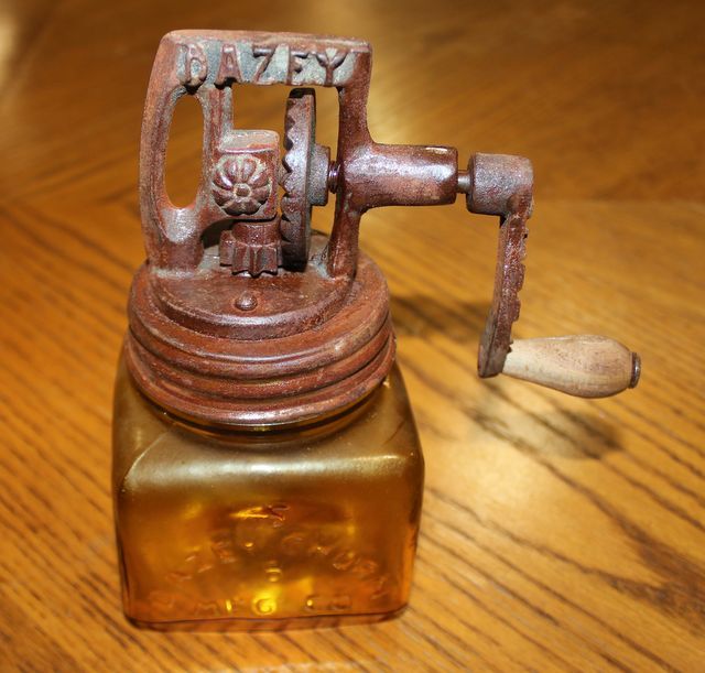 Reproduction Small Amber Dazey Churn 3 1/2" sq., 7" h. Reproduction Small Amber Dazey Churn 3 1/2" sq., 7" h.