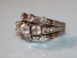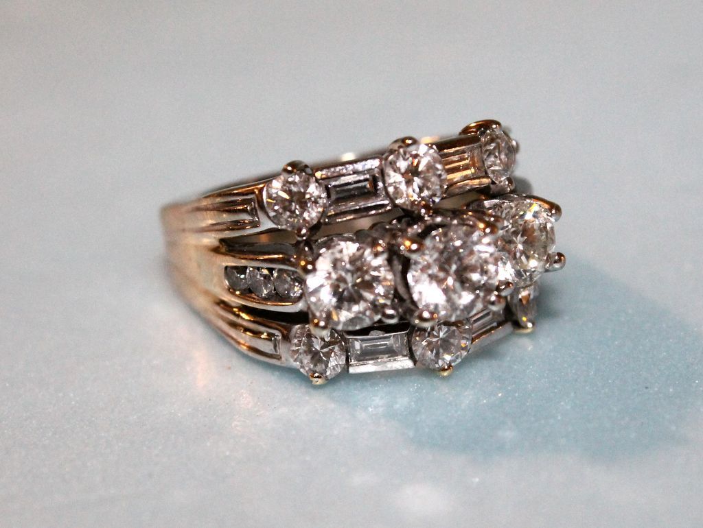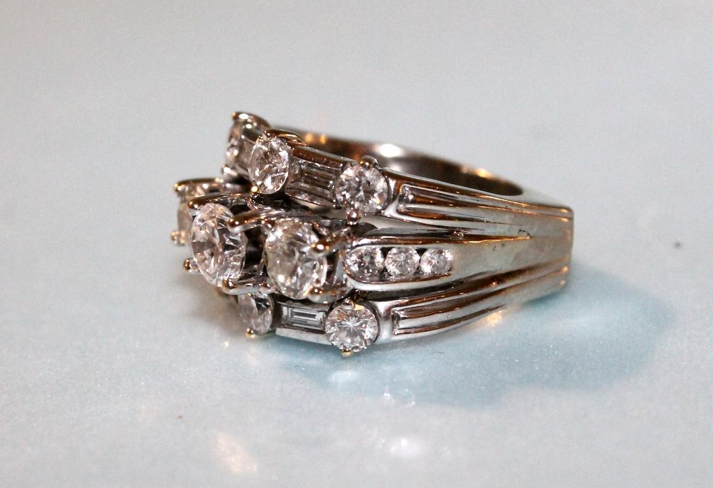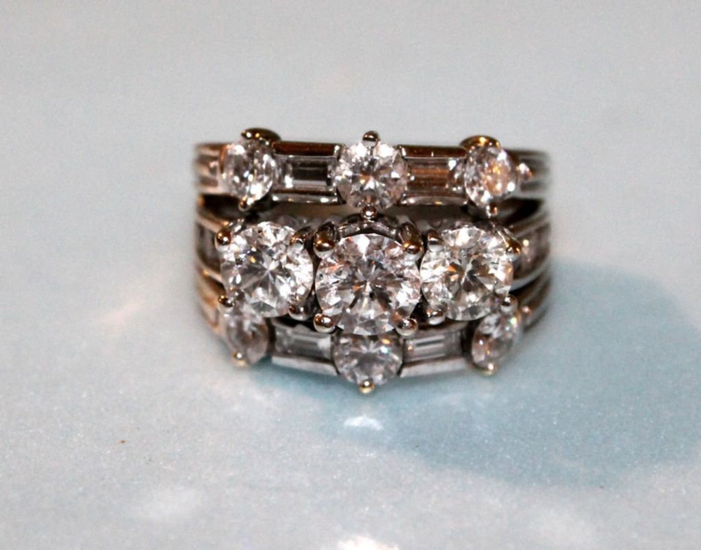 Ladies three row, linear style diamond fashion ring. One round brilliant cut diamond provisional A.G.S. Grade- 3/1/6- Appx. 0.61ct. G.I.A. Grade- F/SI2 Appx. 5.50x5.46.3.28mm; Two round brilliant cut diamonds appx. 5.03x 5.06mm-- appx 1.04cttw. # 3 grade melee-- F-G/ SI 2- I1; Six round brilliant cut diamonds appx. 3.40- 3.80mm- appx 1.0cttw # 2 grade melee- F-G/ VS 2; Six round brilliant cut diamonds appx 2.2-2.4mm- appx 0.27cttw # 2 grade melee- G-H/ I 1; Four straight baguette cut diamonds appx 3.75 x 1.75mm- appx 0.28cttw # 2 grade melee- F-G/ VS; One ladies platinum, 18k & 14k white gold, bright finished, linear style, conversion fashion ring mounting, consisting of a three stone, four prong set center band with round channel set shoulders flanked above and below by a alternating round double prong set & baguette bar set band, all combined to form one ring with a heavy squared euro design shank. Note: This ring is made from three seperate rings combined at the shank to make one ring, tested 18k, 14k & platinum-- 9.73 DWT TGW Ladies three row, linear style diamond fashion ring. One round brilliant cut diamond provisional A.G.S. Grade- 3/1/6- Appx. 0.61ct. G.I.A. Grade- F/SI2 Appx. 5.50x5.46.3.28mm; Two round brilliant cut diamonds appx. 5.03x 5.06mm-- appx 1.04cttw. # 3 grade melee-- F-G/ SI 2- I1; Six round brilliant cut diamonds appx. 3.40- 3.80mm- appx 1.0cttw # 2 grade melee- F-G/ VS 2; Six round brilliant cut diamonds appx 2.2-2.4mm- appx 0.27cttw # 2 grade melee- G-H/ I 1; Four straight baguette cut diamonds appx 3.75 x 1.75mm- appx 0.28cttw # 2 grade melee- F-G/ VS; One ladies platinum, 18k & 14k white gold, bright finished, linear style, conversion fashion ring mounting, consisting of a three stone, four prong set center band with round channel set shoulders flanked above and below by a alternating round double prong set & baguette bar set band, all combined to form one ring with a heavy squared euro design shank. Note: This ring is made from three seperate rings combined at the shank to make one ring, tested 18k, 14k & platinum-- 9.73 DWT TGW
