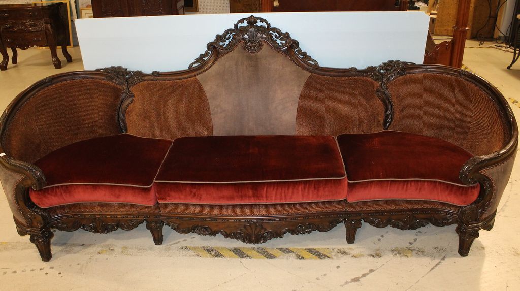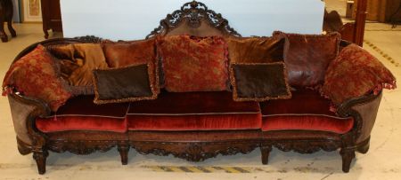 Hand carved triple back sofa with carved roses and scrolls. Sofa is covered in velvet, has three cushions and nine throw pillows; 113"w, 39"d, 48"h Hand carved triple back sofa with carved roses and scrolls. Sofa is covered in velvet, has three cushions and nine throw pillows; 113"w, 39"d, 48"h