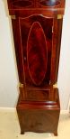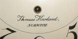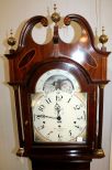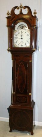 Thomas Harland, Greenfield Village Collection and Henry Ford Museum Grandfather Clock. Figured mahogany case with inlay banding, decorated moon face dial, Westminster chimes. Working, has key; 84" h., 17" w., 11 5/8" d. Thomas Harland, Greenfield Village Collection and Henry Ford Museum Grandfather Clock. Figured mahogany case with inlay banding, decorated moon face dial, Westminster chimes. Working, has key; 84" h., 17" w., 11 5/8" d.