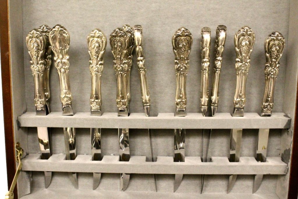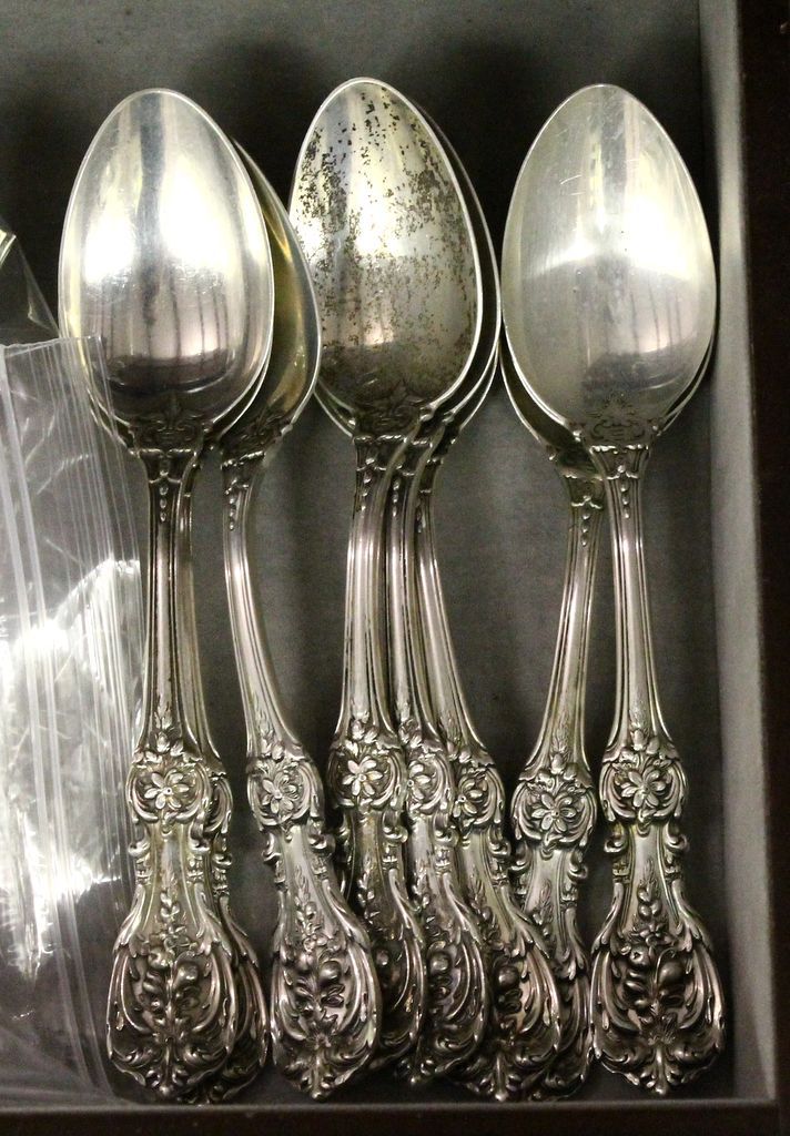 Large set of Reed and Barton Sterling Francis I flatware set consisting of twelve steak knives, eighteen dinner knives, ten butter knives, eight teaspoons with gold wash, sixteen teaspoons, six ice teaspoons, fifteen luncheon forks, twelve dinner forks, nine cocktail forks, twenty-two salad forks, four soup spoons, eight grapefruit spoons, nine tablespoons, jelly spoon, two large pierced vegetable serving spoons, nut spoon, condiment spoon, cheese knife, two large stuffing spoons, small meat fork; 158 total pieces, 190.170 ozt. Large set of Reed and Barton Sterling Francis I flatware set consisting of twelve steak knives, eighteen dinner knives, ten butter knives, eight teaspoons with gold wash, sixteen teaspoons, six ice teaspoons, fifteen luncheon forks, twelve dinner forks, nine cocktail forks, twenty-two salad forks, four soup spoons, eight grapefruit spoons, nine tablespoons, jelly spoon, two large pierced vegetable serving spoons, nut spoon, condiment spoon, cheese knife, two large stuffing spoons, small meat fork; 158 total pieces, 190.170 ozt.