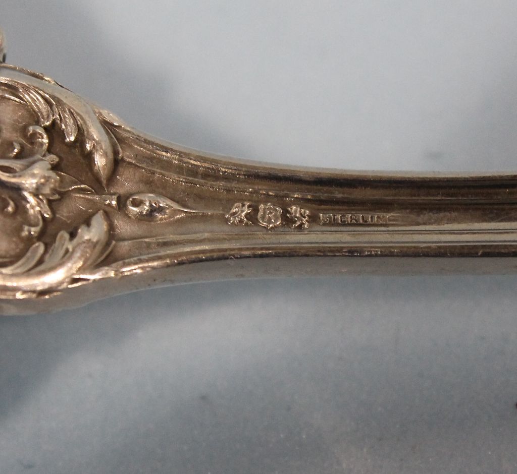 Consisting of fish server, large cold meat fork, large salad fork and spoon, small cold meat fork and pie server; 6 total pieces 22.890 ozt. Consisting of fish server, large cold meat fork, large salad fork and spoon, small cold meat fork and pie server; 6 total pieces 22.890 ozt.