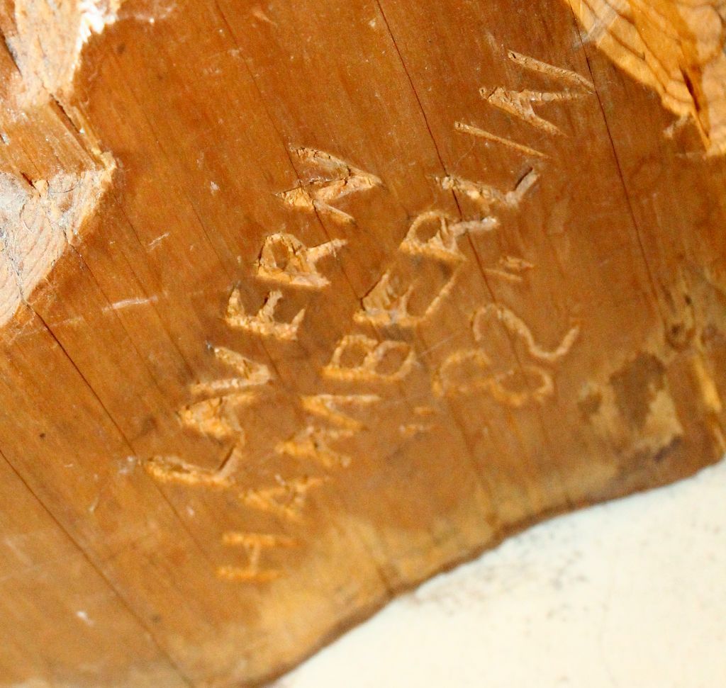 Rare handcrafted wood statue of man and two children by Mississippi artist Lavern Hamberlin, 1982 signed and dated. Hamberlin is from Fayetteville, Mississippi.; 75" h. Rare handcrafted wood statue of man and two children by Mississippi artist Lavern Hamberlin, 1982 signed and dated. Hamberlin is from Fayetteville, Mississippi.; 75" h.